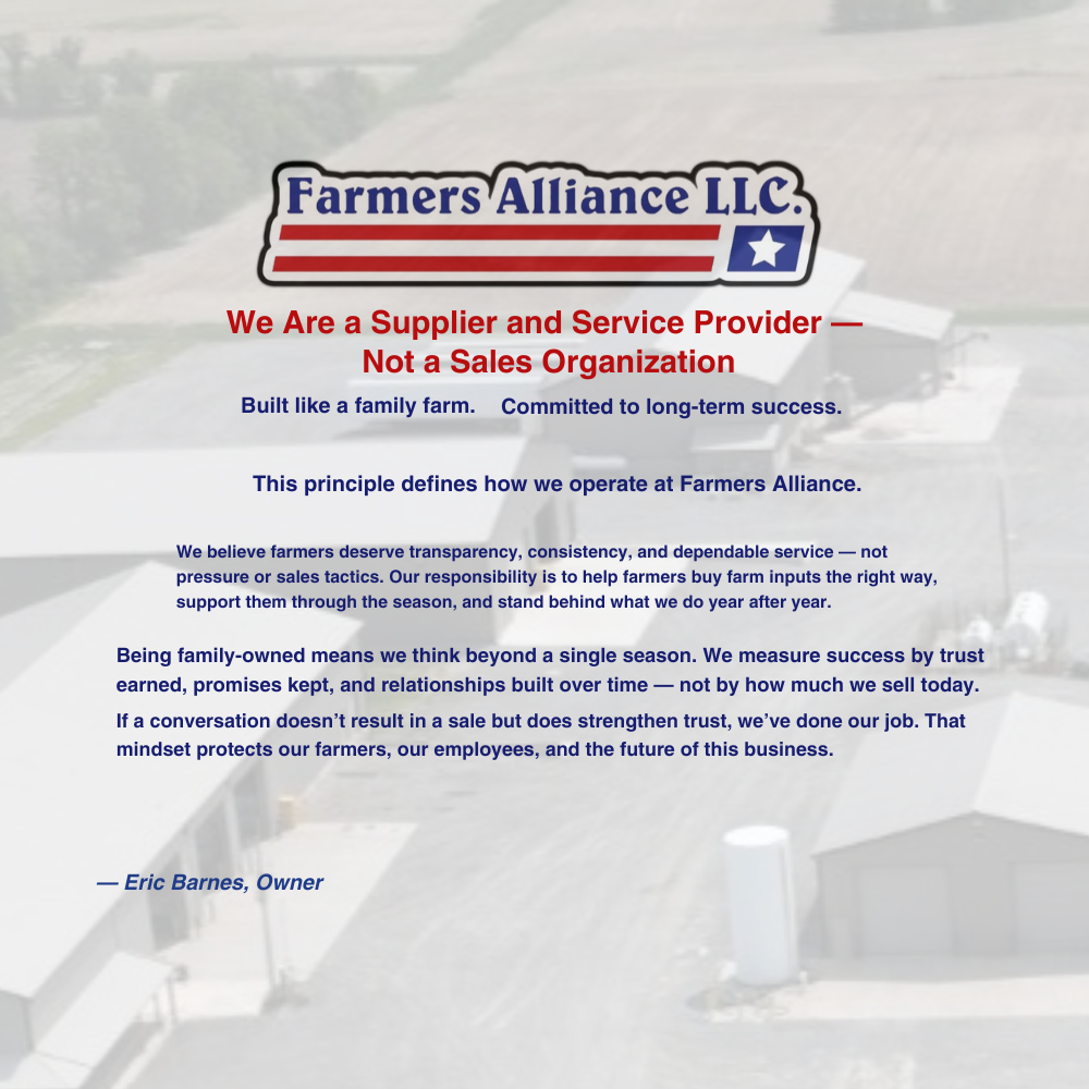 Farmers Alliance is a family owned business that started in August of 2008. The goal of Farmers Alliance, from the beginning, was to be able to come to the market with a different approach from the standard supply chain of crop inputs. With this in mind, we wanted to structure our business in a way that allowed us to be able to focus on our customers and not the sale of products. Farmers Alliance has a main goal of providing our members with as many choices, as possible, while maintaining access to all products and programs at the same time. In doing all of this, we are able to source products to our members at wholesale cost, with no margin added to the price. Along with procuring products for our members, we also provide custom application of the members products that they purchase for their farm, as needed.